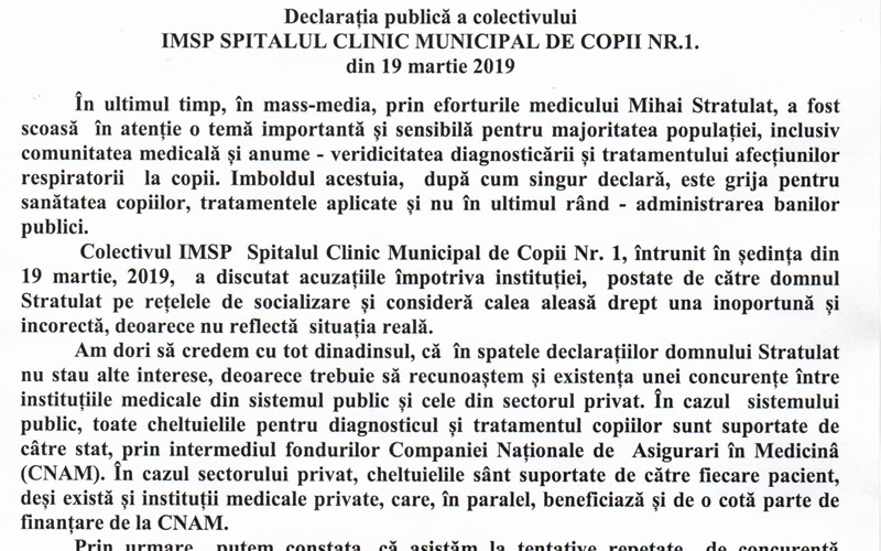 „Am dori să credem cu tot dinadinsul că în spatele deciziilor domnului Stratulat nu stau alte interese, deoarece trebuie să recunoaștem și existența unei concurențe între instituțiile medicale din sectorul public și cele din sectorul privat. În cazul sistemului public toate cheltuielile pentru diagnosticul și tratamentul copiilor sunt suportate de către stat, prin intermediul CNAM. În cazul sectorului privat, cheltuielile sunt suportate de pacient, deși există instituții medicale private, care, în paralel, beneficiază și de o cotă parte de finanțare din partea CNAM”, scrie în declarația medicilor de la spitalul clinic municipal de copii nr.1.
