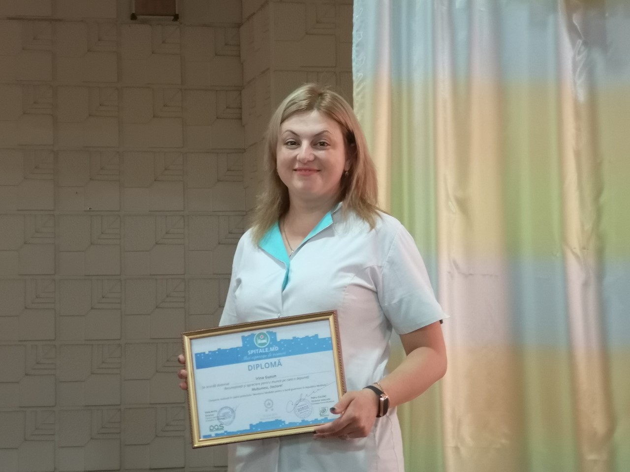 Următoarea destinație a fost raionul Criuleni. Irina Guzun este medic oftalmolog în Spitalul din raion. Era într-o ședință ordinară în momentul în care am intrat în sală. Vădit emoționată, doctorul a spus că nu s-a așteptat la o asemenea surpriză și consideră că a primit cel mai mare premiu obținut vreodată.