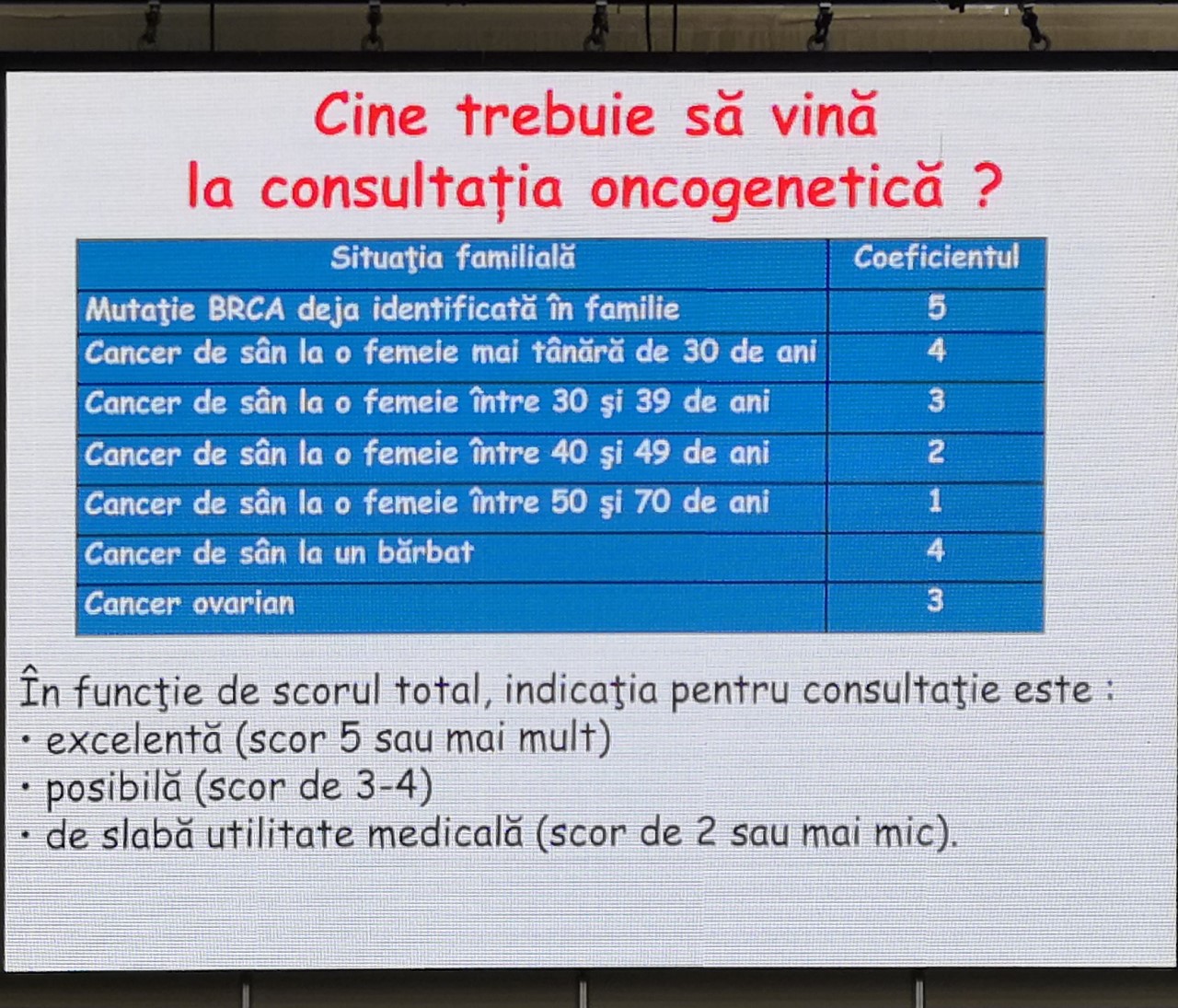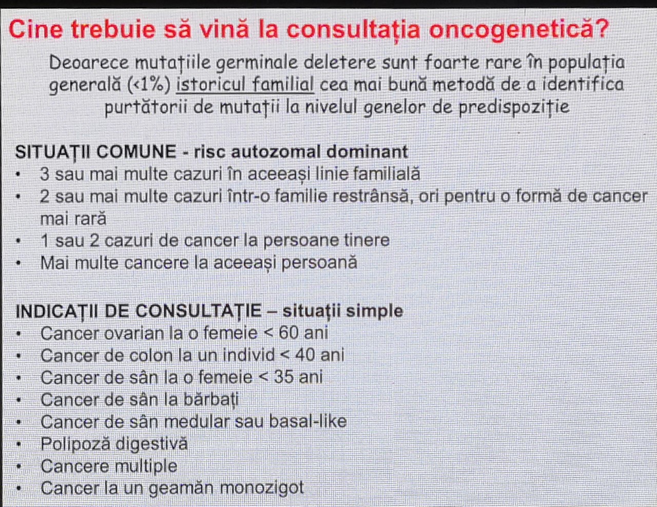 Consultațiile oncologice nu înseamnă o determinare a mutațiilor sau un diagnostic molecular din prima ședință. Consultațiile oncogenetice încep cu un grup de specialiști oncologi, psihologi, terapeuți care fac un arbore genealogic, care aplică niște criterii de selecție și care indică sau nu un diagnostic molecular ulterior, potrivit specialistului.