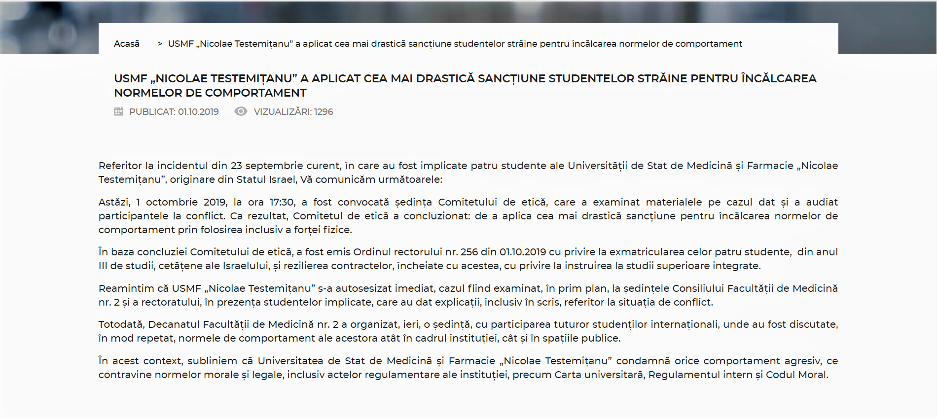 „Subliniem că Universitatea de Stat de Medicină și Farmacie „Nicolae Testemițanu” condamnă orice comportament agresiv, ce contravine normelor morale și legale, inclusiv actelor regulamentare ale instituției, precum Carta universitară, Regulamentul intern și Codul Moral”.