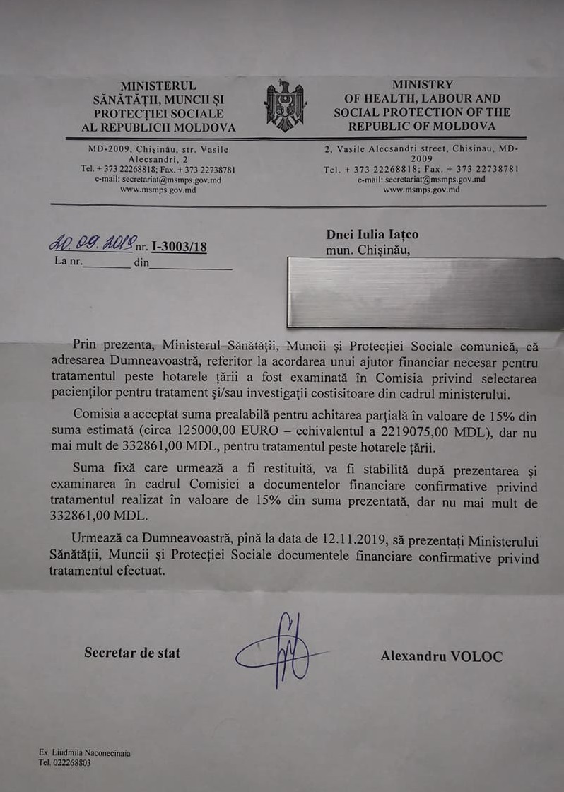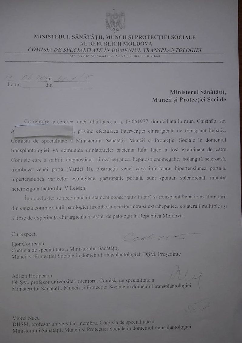„Am depus actele pe 11 iunie 2018. Am primit o scrisoare de la Secretarul general de atunci, Boris Gîlca în care mi se spunea că voi primi răspuns până pe 26 iunie 2018, după ce comisia de specialitate se va întruni. Răspuns pe care nu l-am primit, decât după ce am trimis repetat scrisoare în septembrie 2019. Ultima dată am sunat la ei în noiembrie 2018. Transplantologii de aici mă întrebau ce este cu dosarul meu și de ce nu sun la Minister. Doamna care era responsabilă de dosarul meu, Ludmila Naconecina nu era la muncă. Am găsit-o pe Lilia Oleinic, care arogant mi-a spus că sun în fiecare zi, că îi încurc. „Noi nu putem face nimic, doar răspundem la telefon. Ce vreți de la noi, mergeți la tratament, când reveniți depuneți toate conturile și așteptați”, mi-a răspuns. „I-am zis că a trecut mult timp de la depunerea dosarului. Nu am mai scris de atunci, decât în luna septembrie 2019”, a precizat Iulia.