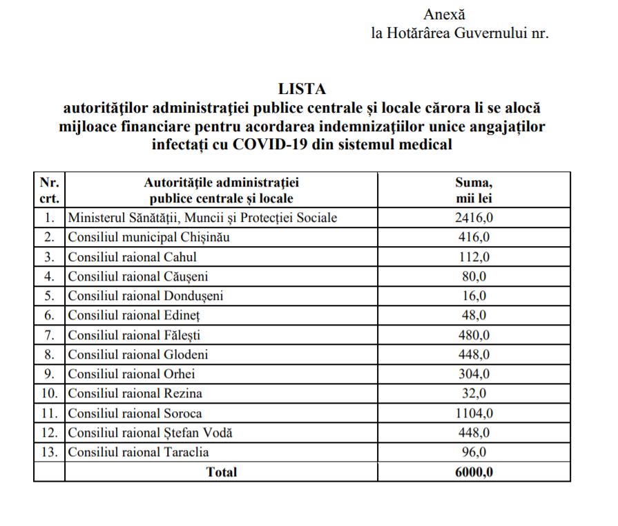 6 milioane de lei au fost alocate pentru acordarea indemnizațiilor unice de 16.000 de lei pentru lucrătorii medicali infectați cu Covid-19. În total, banii vor ajunge pentru 375 de lucrători medicali, deși în total până astăzi avem infectați 556 de lucrători medicali - medici, asistente, infirmiere și paramedici.