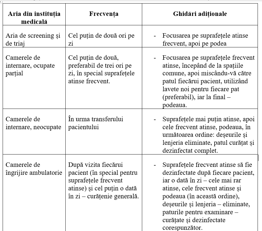 frecvența curățării suprafețelor în funcție de ariile din instituțiile medicale