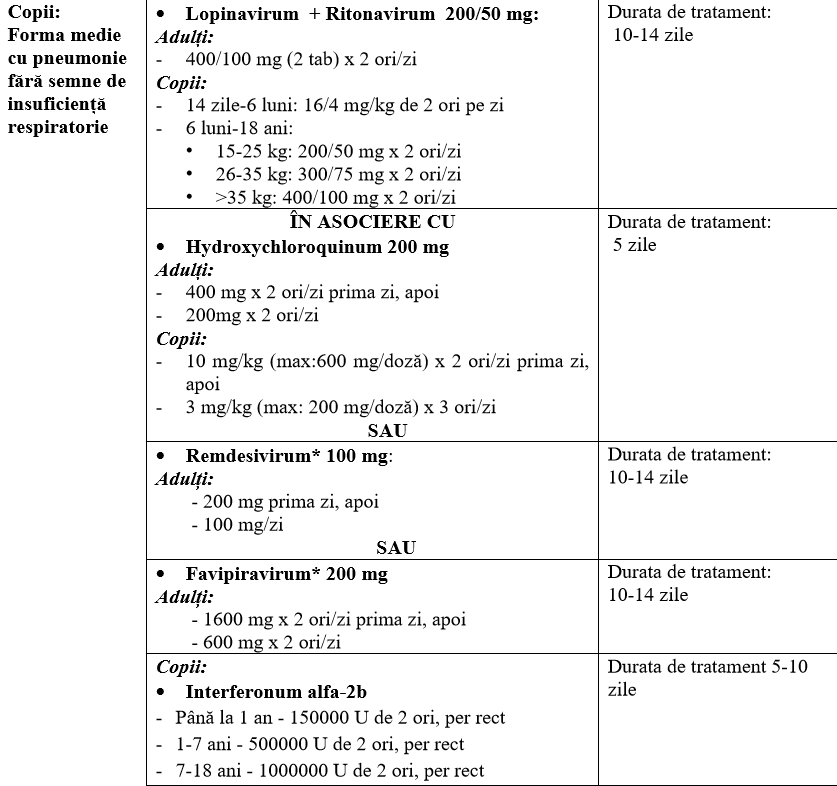În Republica Moldova, hidroxiclorochina este prevăzută în tratamentul adulților și copiilor, atât în forme medii, cât și ușoare, în combinații cu alte medicamente. Pentru formele medii, administrarea se recomandă pentru cinci zile, în asociere cu Lopinavir și Ritonavir, iar pentru pacienții aflați la ventilare mecanică se regăsește recomandarea de a prelungi administrarea până la 14 zile.