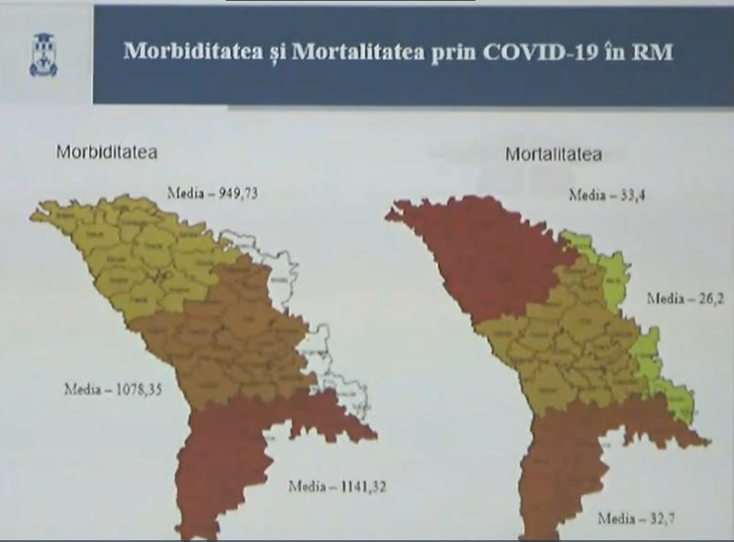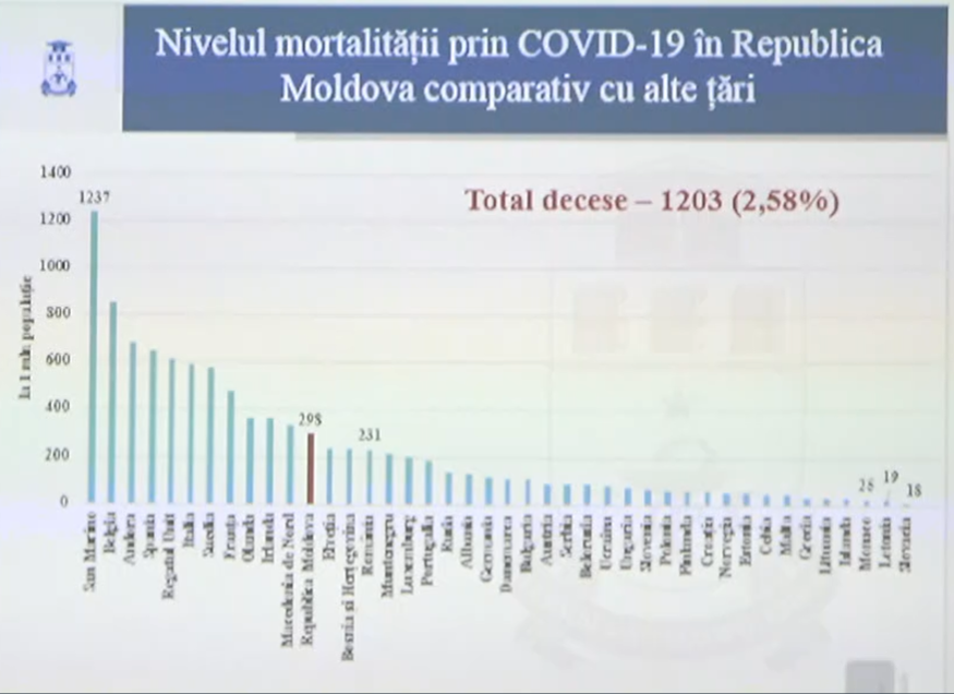 La capitolul mortalitate, Moldova se situează pe locul 12, având un nivel mai sporit decât România, cu 295 de cazuri la un milion de locuitori. În țări, precum Belgia, Spania, Regatul Unit al Marii Britanii, Italia, Suedia, dacă morbiditatea prin SARS-CoV-2 este mai scăzută decât în Moldova, atunci mortalitatea este mai înaltă.