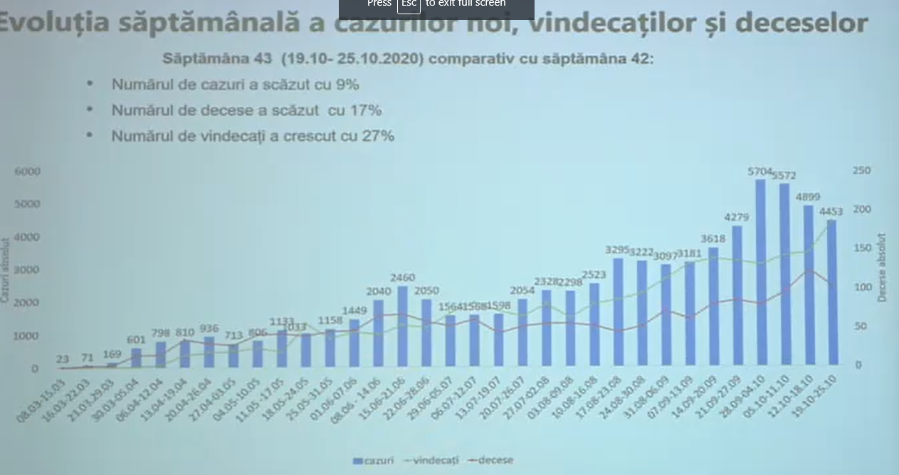 De asemenea, potrivit datelor prezentate de către secretarul de stat Constantin Rîmiș. În săptămâna 43: 19-25 octombrie, în comparație cu săptămâna precedentă, numărul cazurilor înregistrate a scăzut cu 9% și al deceselor cu 17 la sută. Numărul persoanelor vindecate a crescut cu 27 la sută.