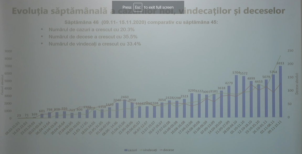 În săptămâna 9-15 noiembrie, numărul cazurilor a crescut cu 20 la sută, a deceselor cu 35,5 la sută și a vindecaților cu 33 la sută. Tot în această perioadă s-au înregistrat 6.933 de cazuri de Covid-19, cu peste 1.000 de cazuri mai mult decât săptămâna precedentă.