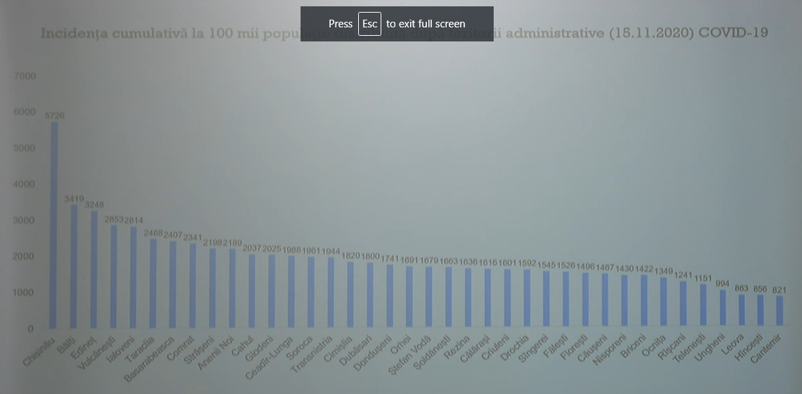 La 15 noiembrie, incidența cazurilor de Covid-19 după teritoriu administrativ, înregistra 5.526 de cazuri la 100 de mii de locuitori, în Municipiul Chișinău. 3.419 în Bălți și 3.248 în Edineț. La polul opus se află Raionul Hâncești cu 856 de cazuri la 100 de mii de locuitori și Cantemir cu 821 la 100 de mii de locuitori.