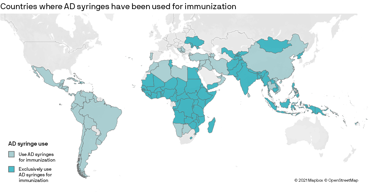 Țările colorate în albastru deschis folosesc seringi AD pentru programele de imunizare. Țările colorate în albastru pronunțat folosesc exclusiv seringi AD pentru imunizare