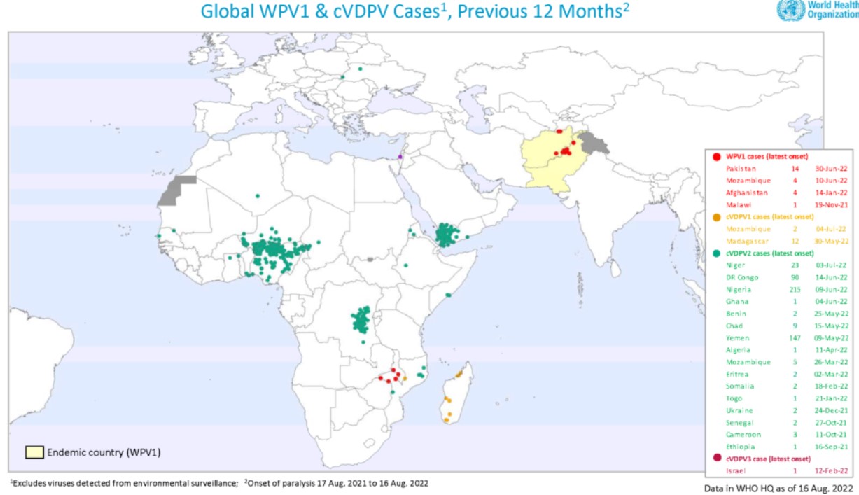În 2020, Covid-19 a determinat o pauză de 4 luni a campaniilor Inițiativei Globale de Eradicare a Poliomielitei și a întrerupt imunizările de rutină, ducând la un risc crescut de boli prevenibile prin vaccinare a peste 80 de milioane de copii, inclusiv poliomielita. Focarele de poliovirus derivate din vaccin s-au triplat între 2019 și 2020, când peste 1.100 de copii au fost paralizați la nivel global. Cazurile au scăzut în 2021, odată cu reluarea imunizărilor. Cu toate acestea, pandemia continuă să suprasolicite sistemele de sănătate, ceea ce duce în continuare la un risc crescut de răspândire. La sfârșitul anului 2021, poliovirusul sălbatic din Pakistan - care împreună cu Afganistanul nu a putut opri transmiterea virusului - a declanșat un focar în Malawi. Criza umanitară din Afganistan ca urmare a schimbării regimului politic de acolo și războiul din Ucraina, unde imunizarea slabă a dat naștere în mod repetat la focare de poliovirus derivat din vaccin, amenință să prelungească flagelul poliomielitei la nivel mondial, mai scrie Bloomberg. Cea de-a 32-a reuniune a unui comitet de urgență convocat de Organizația Mondială a Sănătății a concluzionat în iunie că riscul de răspândire internațională rămâne o urgență de sănătate publică - o declarație făcută pentru prima dată în 2014.