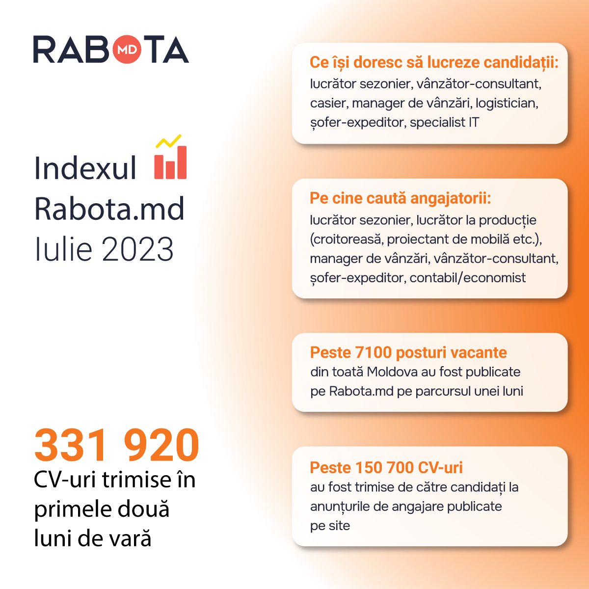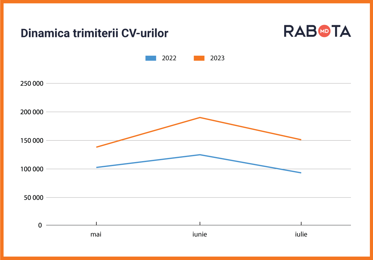 Dacă în luna mai utilizatorii au trimis peste 142 488 de CV-uri prin intermediul Rabota.md, în iunie numărul acestora a ajuns la 181 132 — un record absolut! — iar în iulie a scăzut ușor până la 150 788. În orice caz, în ambele luni de vară au fost trimise cu 50% mai multe CV-uri decât în iunie - iulie 2022.