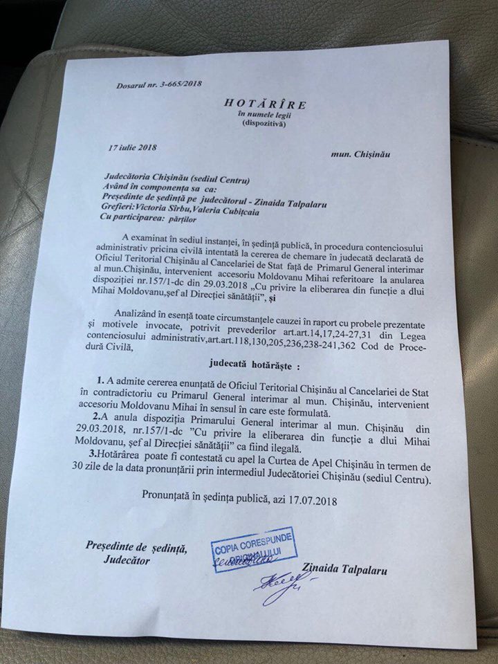 Decizia Judecătoriei Chișinău, prin care dispoziția de demitere semnată de Silvia Radu a fost anulată, datează de astăzi. În hotărârea instanței se menționează că dispoziția 157/1 -dc din 29 martie este ilegală, în baza mai multor articole invocate din Legea privind contenciosul administrativ și Codul de procedură civilă. Hotărârea completă încă nu este publicată pe pagina oficială a instanței. Hotărârea poate fi contestată la Curtea de Apel în termen de 30 de zile.