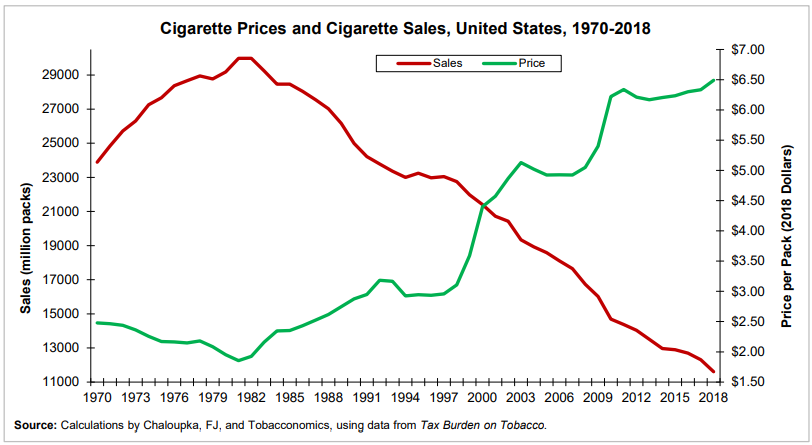 Chiar dacă intervin și numeroși alți factori, evoluția prețurilor la țigarete și a consumului total de țigarete în SUA între 1970 și 2017 indică o legătură strânsă: pe măsură ce prețurile au crescut, nivelul consumului a scăzut.