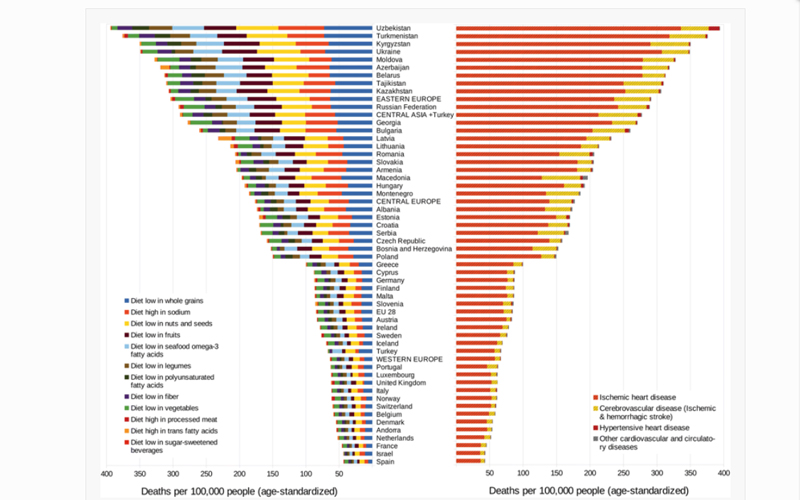 Statele din fosta URSS, printre care și Moldova, se situează în fruntea unui clasament al țărilor în care cele mai multe decese cauzate de maladiile cardio-vasculare sunt legate de alimentația incorectă. Țara noastră se află pe locul 5 în acest top, între Ucraina și Azerbaijan.