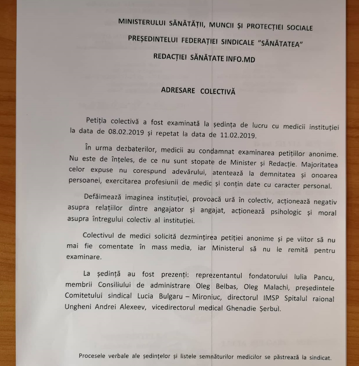 „În urma dezbaterilor, medicii au condamnat examinarea petițiilor anonime. Nu este de înțeles, de ce nu sunt stopate de Minister și Redacție. Majoritatea celor expuse nu corespund adevărului, atentează la demnitatea și onoarea persoanei, exercitarea profesiunii de medic și conțin date cu caracter personal. Defăimează imaginea instituției, provoacă ură în colectiv, acționează negativ asupra relațiilor dintre angajator și angajat, dar și psihologic și moral asupra întregului colectiv al instituției”, se spune în adresare.