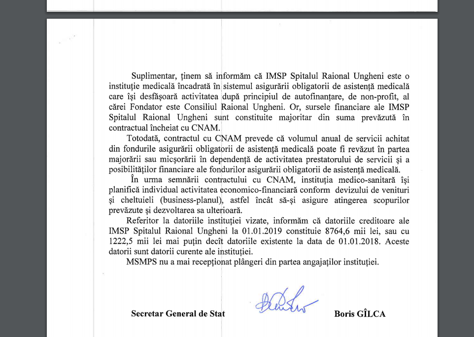 Ei nu au semnat scrisoarea, dar spun că au trimis-o inclusiv Ministerului Sănătății, Muncii și Protecției Sociale (MSMPS), dar și Consiliului Raional Ungheni.