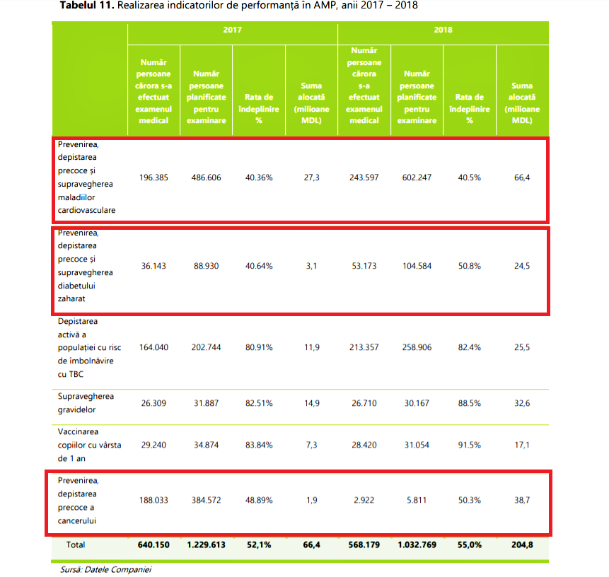 Tot datele CNAM arată că unii indicatori de performanță, cum ar fi depistarea cancerului în forme incipiente, supravegherea maladiilor cardiovasculare și a diabetului au fost realizate numai la jumătate de capacitate.