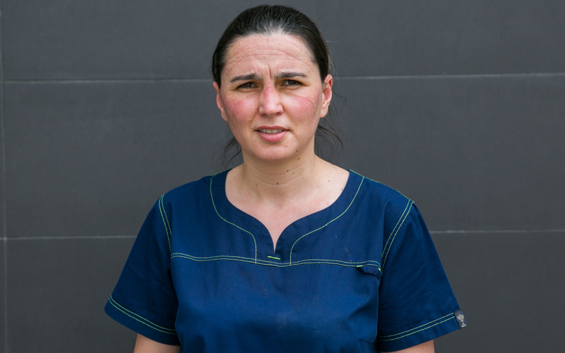 În timp ce ne apropiem de intrarea în bloc, o femeie îmbrăcată în echipament chirurgical iese vârtej pe ușă, își trece palmele de-a lungul feței, apoi prin păr și ridică fața spre cer lăsându-și umerii pe spate, inspirând adânc de câteva ori. Stă așa câteva secunde apoi începe să se plimbe agitat doi metri la dreapta - doi la stânga.