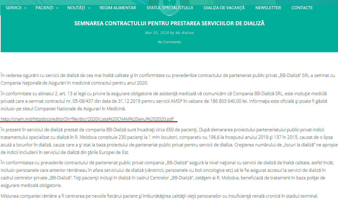 BB Dializa este compania privată cu cel mai gras contract – peste 186 de milioane de lei. Sănătate INFO a scris de mai multe ori despre domeniul hemodializei, fiind de interes public și pentru faptul că se desfășoară printr-un PPP în domeniul medical. BB Dializa însă este total netransparentă. Pe site-ul oficial al instituției nu a fost publicat niciun contract. Numai după ce Sănătate INFO a scris că instituția nu respectă principiile de transparență, instituția a publicat un anunț sec, în care dă un link inactiv către informația sumară de contractare publicată de CNAM.