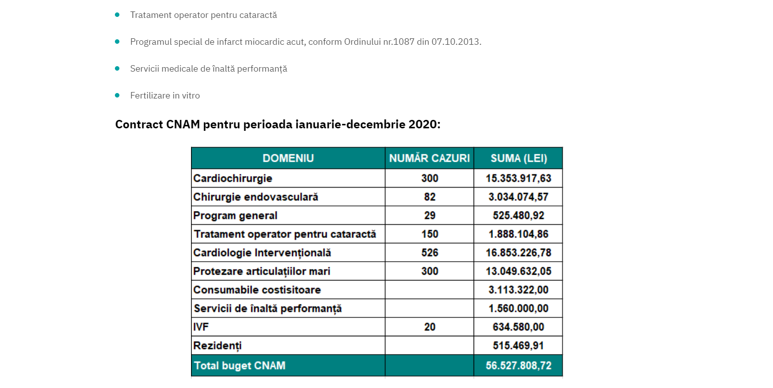 Cardiomed SRL, actuala clinică Novamed, a fost contractată cu suma de peste 29 de milioane de lei, dar informații despre contractul semnat sunt de negăsit pe pagina instituției. Pe site-ul clinicii există o rubrică dedicată contractelor cu CNAM, doar că în realitate nu au fost publicate contractele, ci unele date spicuite – serviciile medicale și numărul de cazuri contractate. Nu este indicată suma totală contractată, nu este indicat tariful serviciului. În plus, informațiile publicate se referă la anii 2018 și 2019.