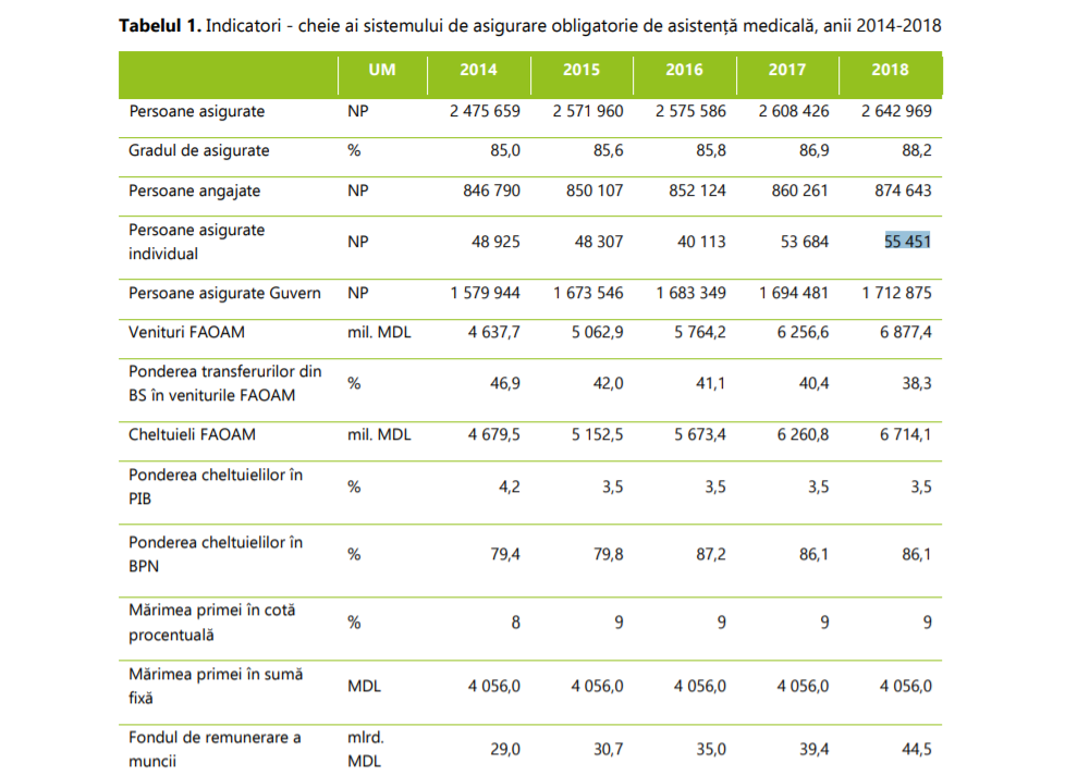 În Republica Moldova este asigurată medical aproape 90% din populație, potrivit ultimului raport al CNAM pentru anul 2018. Asta înseamnă 2 milioane 642 de mii 969 de moldoveni asigurați. Dintre aceștia, aproape 875 de mii de oameni sunt angajați. Împreună cu angajatorii, persoanele angajate plătesc 9% din salariu pentru polița medical. Cu cât salariul este mai mare, cu atât și suma pentru poliță este mai mare. Alte peste 55 de mii de persoane s-au asigurat individual, iar alte alte aproape 1 milion 713 mii de ceteățeni sunt asigurați de către stat cu poliță medicală.
