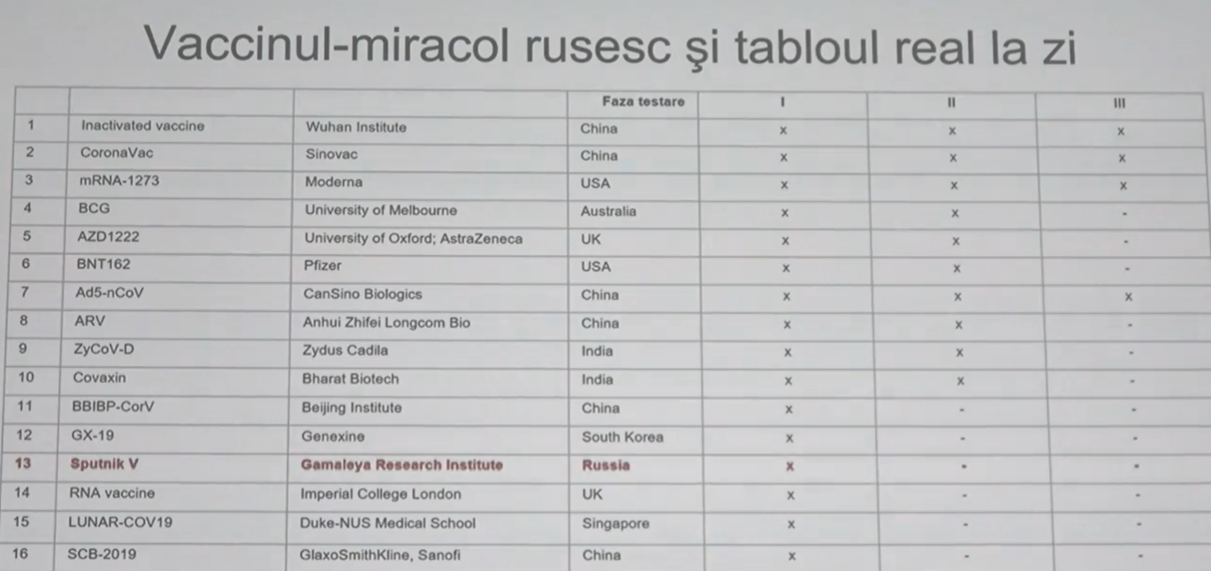 În acest moment, 16 vaccinuri împotriva Covid-19 sunt în proces de elaborare. Doar 4 dintre ele sunt la etapa a III-a de testare, cea mai importantă și cea mai de durată. 10 vaccinuri sunt în faza a II-a, anunță virusologii de la Agenția Națională pentru Sănătate Publică (ANSP). Vaccinul produs în Rusia, despre care se vorbește foarte mult în ultima perioadă, a trecut abia de prima fază, astfel că, specialiștilor le este greu să se expună asupra eficacității acestuia.