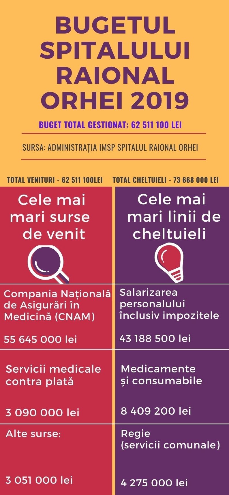În 2019, Spitalul Raional Orhei a gestionat un buget total de 62,5 milioane de lei. Cel de la Rezina, care tratează și pacienți din stânga Nistrului, a avut un buget mult mai mic, de 26 de milioane, iar Spitalul Raional Șoldănești – de puțin peste 23 de milioane de lei.
