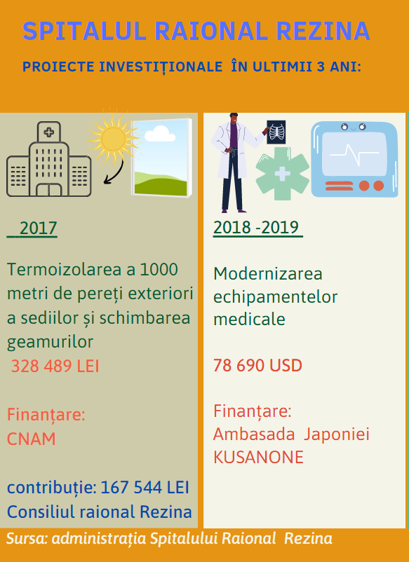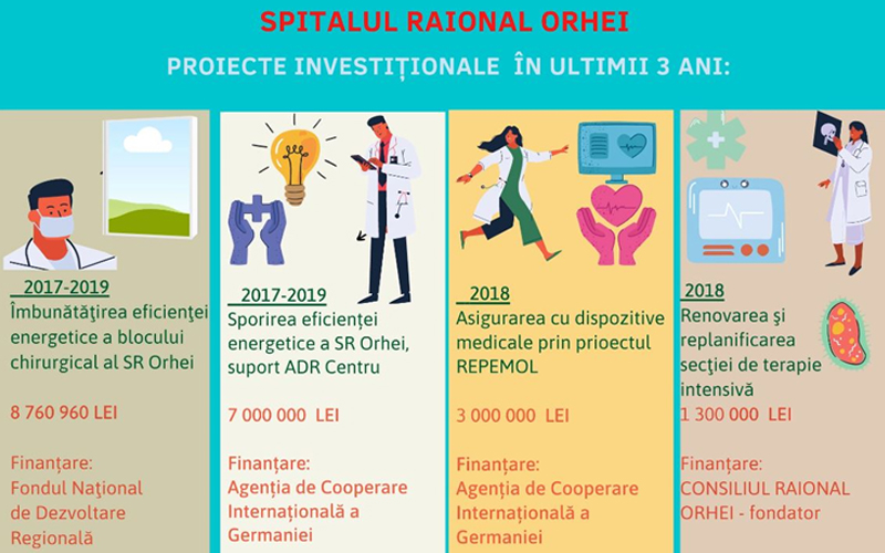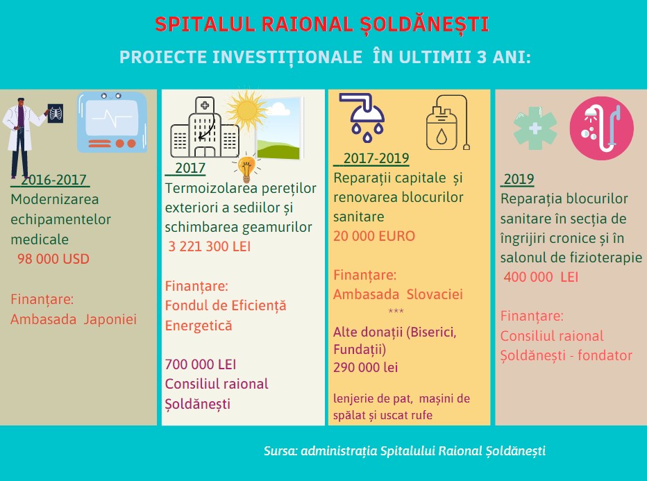 Cele mai mari investiții, pe care le-au făcut, cele trei spitale raionale în ultimii trei ani, sunt pentru renovarea și izolarea termică a unor secții. Banii au fost alocați în cadrul proiectelor investiționale, cei mai mulți bani venind prin programele de creștere a eficienței energetice.
